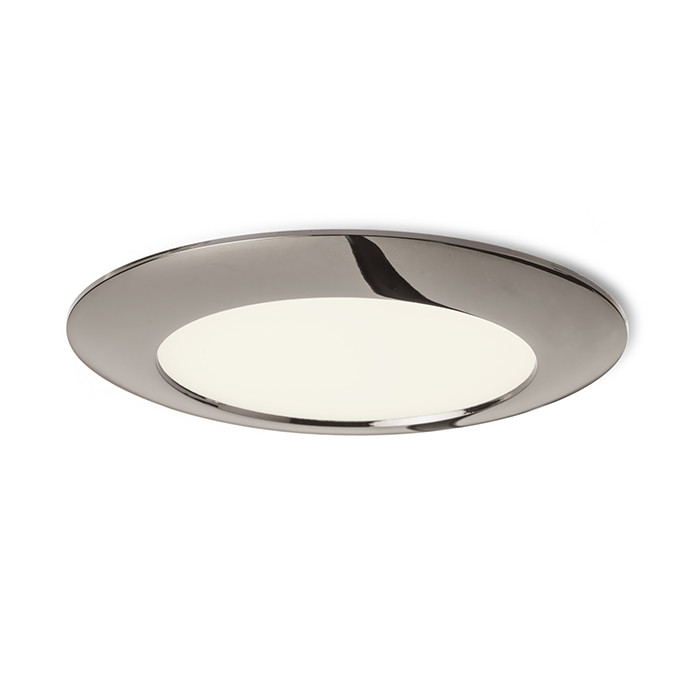 Kerek süllyesztett LED lámpa gipszkarton mennyezetekhez lekerekített kerettel és alacsony süllyesztési mélységgel.